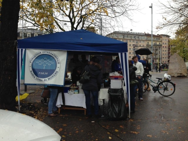 Llevando en alto la bandera de la solidaridad liderada por la Dra. María Luisa Piraquive en todo el mundo, en la Plaine de Plainpalais uno de los mercados mas conocidos de la Ciudad de Ginebra – Suiza, nuestro equipo de voluntarios realizaron una particular actividad en la que a través de la entrega de artículos elaborados en el taller de manualidades y muestras de gastronomía internacional, recibían a cambio un donativo, resaltando de esta manera la importancia de ayudar a los demás.